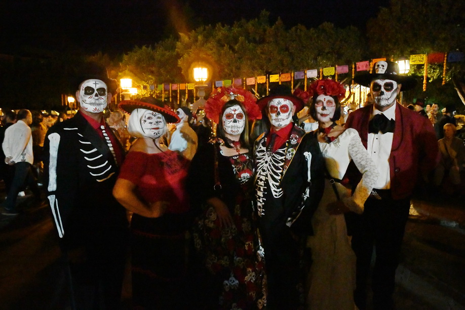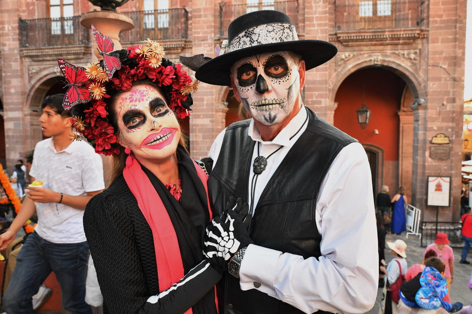 Catrina, recurring figure in Mexican visual arts depicted as a lively skeleton wearing a large plumed hat associated with early 20th-century upper-class European women's fashion. La Calavera Catrina (The Dapper Skull or The Dapper Skeleton)-the figure's name in full-was created by Mexican printmaker Jose Guadalupe Posada in the early 20th century and became an icon in Mexico through her popularization by artists such as Mexican muralist Diego Rivera and a traveling art exhibition during World War II. The skeletons depict individuals from all classes and occupations, which scholars have interpreted as symbolic of a macabre egalitarianism, suggesting that regardless of status, death comes for all. She was further popularized when Rivera portrayed her at the center of his 1947; Dream of a Sunday Afternoon in the Alameda Central Park. Rivera thus transformed Catrina into a central symbol of the duality of Mexican history, religion, and life and death itself. Through Rivera's interpretation Catrina has become a national symbol of modern Mexico. Her unmistakable visage and hat are reproduced in various forms at Dia de los Muertos (Day of the Dead) celebrations on November 1 and 2. Altars to the deceased often feature figurines of Catrina, while individuals paint their faces and wear elaborate costumes to emulate the calavera. Her status in the festival, a combination of Aztec celebrations of death and the Roman Catholic holidays of All Saints 'Day and All Souls' Day, has thus continued her association with the dual heritage of Mexican identity. (https://www.britannica.com/topic/Catrina) At makeup stalls set up in the streets of San Miguel de Allende, women and men simultaneously got Catrina-style makeup done in preparation for the Day of the Dead. While the traditional Catrina figure is female, there's no inherent restriction preventing a male version. A male Catrina could certainly exist as a modern interpretation, still fitting within the themes of social satire and the universality of death.
