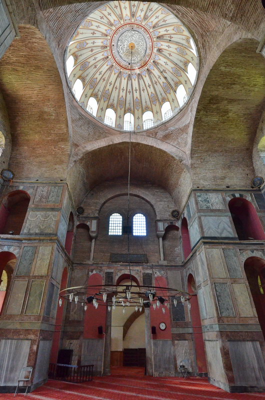 Kalenderhane Mosque is a former Eastern Orthodox church in Istanbul, converted into a mosque by the Ottomans. With high probability the church was originally dedicated to the Theotokos Kyriotissa. This building represents one among the few extant examples of a Byzantine church with domed Greek cross plan. The mosque is located in the Fatih district of Istanbul, Turkey, in the neighborhood of Vefa, and lies immediately to the south of the easternmost extant section of the aqueduct of Valens, and less than one km to the southeast of the Vefa Kilise Mosque. The building has a central Greek Cross plan with deep barrel vaults over the arms, and is surmounted by a dome with 16 ribs. The structure has a typically middle Byzantine brickwork with alternating layers of brick and stone masonry. The sanctuary is on the east side; however, the reconstructed mihrab and minbar are in a corner to obtain the proper alignment with Mecca. As a whole, the mosque of Kalenderhane represents together with the Gul Mosque in Istanbul, the Church of Hagia Sophia in Thessaloniki and the Church of the Dormition in (Koimesis) in Iznik (Nicaea), one of the main architectural examples of a domed Greek ross church from the Byzantine middle period. (Source: en.wikipedia.org)
