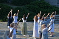 Paneurhythmy is a system of physical musical exercises developed by Peter Deunov between 1922 and 1944, focused on achieving inner balance and harmonization. The emphasis of the exercises is on giving and receiving, with the goal of creating a conscious exchange with the forces of nature. Paneurhythmy is practiced for both physical fitness and spiritual development. The Paneurhythmy practice promotes the processes of self-perfecting, expanding of the consciousness, and attaining virtues. These exercises are in harmony with the creative universal rhythm that constructs and organizes the entire nature, so they are powerful. They allow you to conduct the earthly and heavenly energies through yourself in a balanced way achieving inner peace and harmony with the surrounding world. The reception and proper distribution of the solar energies carried out during these exercises support the functions of the physical body as well as the functions of the subtler human bodies. Practicing the Paneurhythmy stimulates the creation of healthy habits and will raise the sense of wellness. The idea of living in harmony with nature is prominent in the practice of Paneurhythmy. Based on Deunov's recommendations, Paneurthythmic exercises were to be done in the early morning and outside, preferably in a green meadow, and were most effective in the Spring, beginning the 22nd of March. In his opinion, this was the time when nature was most receptive and contained the most prana or living energy that could be absorbed by the human body. The society was set up by Bulgarian spiritual teacher Peter Deunov in the 1920s. Deunov died in 1944 but followers continue to apply his teaching. The society's name does not refer to ethnicity or race but to light and purity of the soul and the belief that all people can live in harmony, followers Paneurhythmy, aims to help devotees link with cosmic energy. Over time, Paneurhythmy has attracted the attention of people from different cultures and nationalities, despite the 40-year communist regime in Bulgaria that forbids such practices.